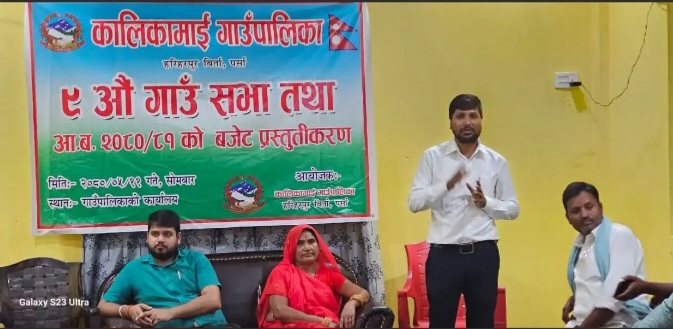 पर्सा । पर्साको कालिकामाई गाँउपालिकाको ९ औँ गाउँ सभा तथा २०८०/८१ को बजेट प्रसतुतीकरण कार्यक्रम सम्पन्न भएको छ । गाउँ सभा बजेट प्रसतुतीकरण कार्यक्रम बाट आगामी आर्थिक वर्ष २०८०/८१ को लागि ३२ करोड ७४ लाख ९८ हजार २ सय रुपैयाँको अनुमानित बजेट गाउँपालिका उपाध्यक्ष राजमती देबी बरैनीको निर्देशनमा गाउँपालिकाका प्रमुख प्रसाशकिय अधिकृत नमोनाथ यादवले बजेट प्रसतुतीकरण गरेका थिए । गाउँ सभा कार्यक्रम गाउँपालिका का अध्यक्ष बशिष्ट कुमार गुप्ताको अध्यक्ष्ातामा भएको कार्यक्रममा पालिकाले कृषि, शिक्षा, स्वास्थ्य,सिचाई, पर्यटन र भौतिक पूर्वाधारको लगायत ,उज्यालो कालिकामाई गाउँपालिका बनाउन मुख्य प्राथमिकतामा राखेको बताए । सबै क्षेत्र विकास मुखी बनाउनका लागि आफू प्रतिबद्ध रहेको बताउँदै अध्यक्ष गुप्ताले आवश्यक्ताका आधारमा बजेट बिनियोजन गरिएको बताए । कालिकामाई गाउँपालिकाको वडा नं १ देखि लिएर वडा नं ५ सम्म का वडा स्तरिय बजेट सेलिंग यस मा सबैको सहमती बाट समेटिएको गाउँपालिका अध्यक्ष गुप्ता ले बताए । गाउँ सभामा ससर्त अनुदान १२ करोड ७२ लाख ५७ हजार, सामनिकरण अनुदान ९ करोड २५ लाख, राजस्व बाडफाड ६ करोड ६४ लाख ५९ हजार २ सय, सम्पुर्क अनुदान ५० लाख समानिकरण अनुदान ६४ लाख ८२ हजार, राजस्व बाडफाड १५ लाख, सम्पुरक अनुदान २० लाख, विशेष अनुदान ३० लाख, आन्तरिक श्रोत ५० लाख गरि ३२ करोड ७४ लाख ९८ हजार २ सय बराबर को बजेट प्रस्तुतकरण गरिएको छ । गाउँपालिका कार्यालय को सभा हलमा भएकाे गाउँ सभा बजेट प्रस्तुतीकरण प्रमुख प्रसाशकिय अधिकृत नमोनाथ यादव  स्वागत मन्तब्य राखेका थिए । वडाअध्यक्ष लालबाबु चौरसिया, संजय पटेल, सोनालाल चौरसिया, संजय साह गोढ, जयनारायण कुर्मी, कार्यपालिका सदस्य हरिअोम साह कार्यपालिका सदस्य ,गाउँपालिका महिला ,पुरुष सदस्य कर्मचारी, लगायतको सहभागीता रहेको थियो । कार्यक्रम संचालन बिक्रम राउत बरैले संचालन गरेका थिए ।